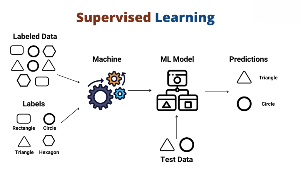 - Labeled Data: The training dataset used in supervised learning consists of examples where each input data point is associated with a known output label. These labels are provided by humans or generated through manual annotation.